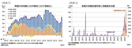 賃金は、名目賃金が23年5-7月期の前年同期比で8.5%、実質賃金は1.2%と上昇が継続した。NHS職員や公務員への一時金支払が上昇率を押し上げたが、ボーナスを除く定期賃金伸び率も前年同期比7.8%とデータ公表以来最も高い伸び率で横ばい推移している。実質の定期賃金上昇率は前年同期比0.6%だった。