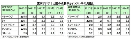 1. 東南アジア5カ国は景気減速傾向にある。2023年4-6月期はインドネシアだけが堅調さを保ったが、その他4カ国は期待外れの結果だった。経済の貿易依存度の高いタイとマレーシア、ベトナムは輸出低迷に苦しんでおり、フィリピンは物価と金利の高止まりにより民間消費の勢いが弱まり、3四半期連続で成長率が低下した。