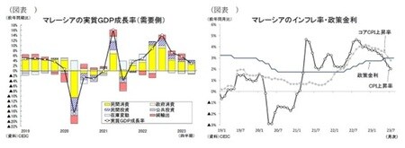 7月の消費者物価上昇率は前年同月比+2.0%と、昨年8月から低下傾向にあり、23年後半もベース効果と内需の緩慢な成長により低めの水準で推移するとみられる。マレーシア中銀は金融政策の正常化を遂げており、24年も政策金利を現行水準で維持すると予想する。