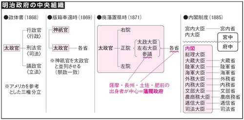 そして、政府中央組織は、太政官の正院(太政大臣・左右大臣・参議)が最高行政機関となり、薩摩・長州・土佐・肥前の下級藩士出身者が参議や各省の卿(長官)などの地位を握って、藩閥政府が確立しました。