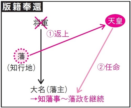 そこで、新政府は版籍奉還(1869)を実施し、将軍から御恩として与えられた藩の領地(版)と領民(籍)を天皇へ返上させました。そして、旧大名は同じ藩の知藩事に任命され、引き続き藩内の統治にあたりました。