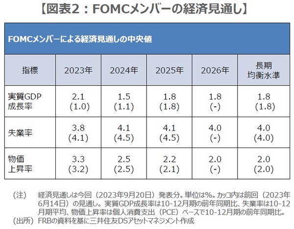 次に、FOMCメンバーが適切と考える「政策金利水準の分布図(ドットチャート)」をみると(図表1)、2023年末のドット中央値は前回6月と変わらず、年内あと1回、25ベーシスポイント(bp、1bp=0.01%)の利上げが示唆されました。また、2024年末のドット中央値が上方にシフトしたため、前回は2024年に25bpの利下げ4回が示唆されていましたが、今回は25bpの利下げ2回に減少し、タカ派的な印象を与える結果となりました。