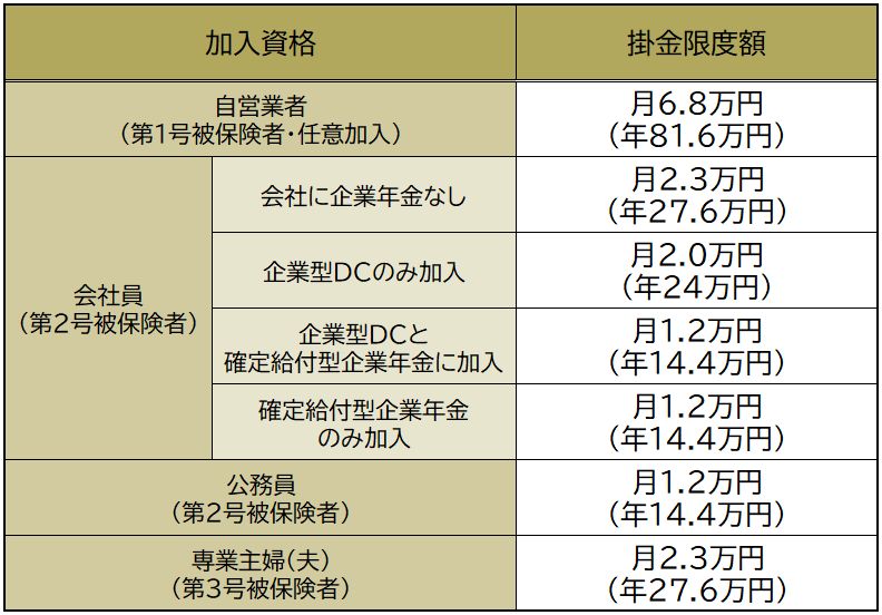 iDeCoの掛金は月額最低5,000円からで、1,000円単位で自由に設定できます。限度額は以下の通りです。iDeCoは、毎月の掛金に限度額が設定されています。限度額は、働き方(会社員、公務員、自営業)によって異なります。また、会社員の場合は勤務先に企業年金(企業型確定拠出年金(企業型DC)、確定給付年金等)の制度があるか否かによって細かく定められています(【図表】参照)。