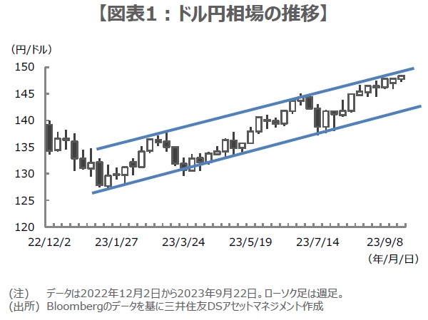 つまり、今回のFOMCは、政策金利水準がより高くより長くなることを、そして日銀金融政策決定会合は、金融緩和は当面継続される可能性が高いことを、それぞれ市場に意識させる結果となり、ドル円については、ドル買い・円売りの材料になりやすいと思われます。改めて、年初からのドル円相場の推移を振り返ると、図表1の通り、ドル高・円安トレンドにあることが確認されます。