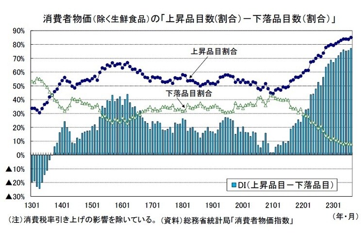 上昇品目数の割合は85.1%(7月は83.7%)、下落品目数の割合は7.9%(7月は8.0%)、「上昇品目割合」-「下落品目割合」は77.2%(7月は75.7%)であった。