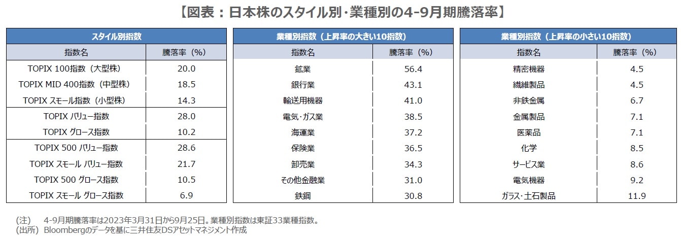 スタイル別、業種別指数の4-9月期騰落率は図表の通りですが、これらも、おおむね4-6月期に大きく上昇後、7-9月期に低迷、という傾向がみられました。春先は、インバウンド(訪日外国人)需要の回復や、東京証券取引所(以下、東証)の要請(企業に資本コストや株価を意識した経営を要請)などの好材料が株価を押し上げたものの、夏場は海外投資家の買いがやや一巡する場面もみられ、「夏枯れ相場」になったと推測されます。