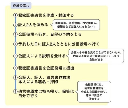 遺言書の内容を秘密にしながら、遺言書が存在するという公的な証明を行い、紛失などのリスクを回避するのが「秘密証書遺言」です。