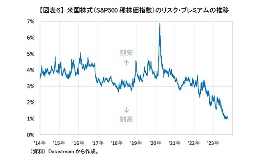 予想PERの逆数(益利回り)から米長期金利を引いた米国株式のリスク・プレミアムをみると、リスク・プレミアムは2023年6月以降さらに低下し、足元1%前後で推移している【図表6】。2022年8月以前は概ね3%以上で推移してきたことを踏まえると、かなりの低水準である。