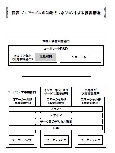 コーポレートR&Dの企画を行うチームのひとつとして「IPカウンセル」(知財戦略部門)があり、そのほかにハードウェア事業部門(iPhoneのようなものづくりビジネスを実行)、インターネット及びサービス事業部門(App StoreやiTunesなどのソフトウェアやコンテンツサービスを実行)、小売及び店舗事業部門(製品・サービスを顧客に届けるためのオンラインストアや店舗運営、知財ライセンス事業を実行)といった各事業部門の中に「コマーシャルIP」(事業知財部)といわれる各事業部門のビジネスの実行現場に寄り添った知財担当者のチームが用意されています。
