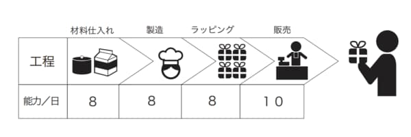 括弧内の数字は、それぞれの工程の、1日あたりの能力です(仕入れは1日あたり10個分の菓子の原材料を仕入れる能力がある。製造は5個の製造能力、ラッピングは8個、販売は11個)。