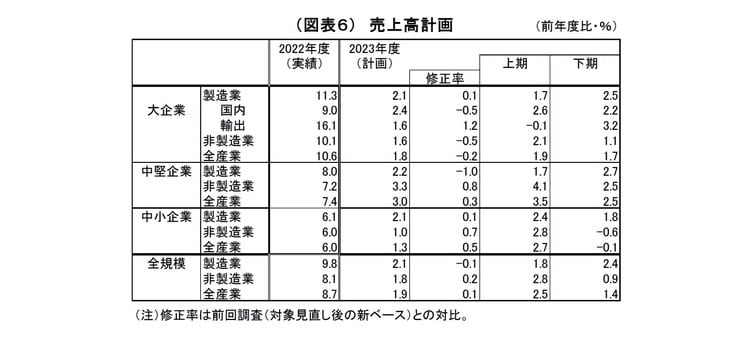 2023年度収益計画(全規模全産業)は、売上高が前年比1.9%増(前回は1.8%増)、経常利益が2.7%減(前回は同5.8%減)となった。