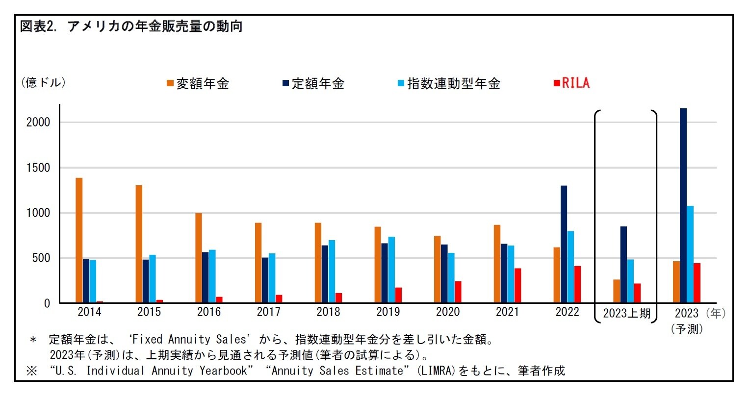 一方、定額年金の販売はほぼ横ばいで推移していたが、2022年には急増した。2023年も前年を上回る勢いで販売が進んでいる。それとともに、指数連動型年金の販売も伸びている。