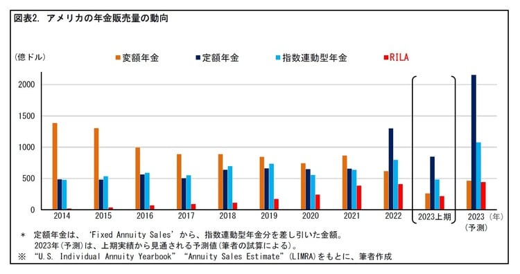 2022年以降、RILAの販売も増加傾向にある。アメリカでは、変額年金からRILAへ販売がシフトしつつあると言え、2023年には両者の販売量は拮抗するものと予測される。