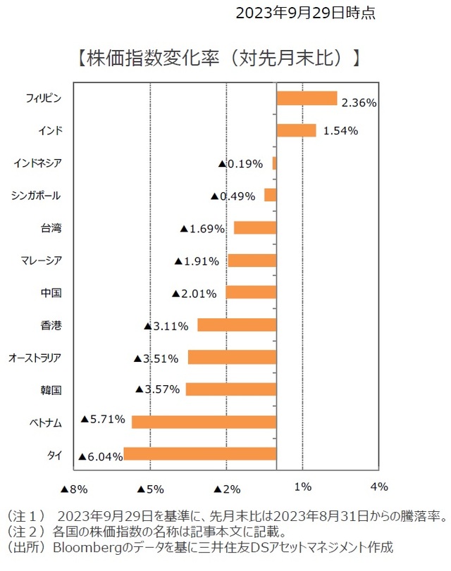 一方、景気の鈍化が続く中、インフレ抑制を目的に中央銀行が政策金利を引き上げたタイが下落したほか、ベトナムも中央銀行が金融市場から流動性を吸収したことなどが嫌気された。韓国は、リチウム価格下落により電気自動車(EV)バッテリー関連銘柄が軟調に推移し、オーストラリアも、世界的な金利上昇を受けて、不動産関連銘柄が下落。香港は、中国の半導体高度化を警戒する米国政府が中国のファーウェイ社の新型スマートフォンについて技術的な検証を始めると伝わり、米中関係悪化懸念が強まった。