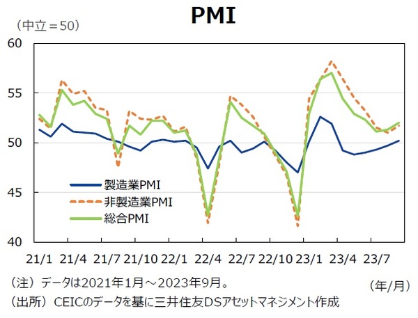 製造業購買担当者景気指数(PMI)は9月に市場予想を超えて50.2へ上昇した。季節性および政策対応の効果を反映した結果である。しかし、需要不足を指摘する製造業が回答者全体の58%を超えており、製造業のセンチメント改善は一時的と思われる。また、8月下旬に政府は鉄鋼生産(付加価値ベース)の2023年目標を+3.5%前後と設定したが、1~8月に前年同期比+7.6%であるため、9月以降には鉄鋼生産は減産を迫られ、製造業PMIの下押し要因になるだろう。景気抑制の主因は住宅価格の下落に起因する負の資産効果を通じた消費低迷であるとみられ、この点を改善しなければ需要不足による景気抑制の問題解決は困難であろう。