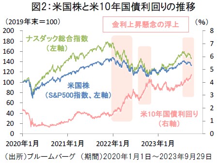 高金利の長期化観測の浮上に伴って、足元で米10年国債利回りの上昇が顕著となっています。2023年初来、ハイテク株主導の株高が続いてきた米国株式市場では、米10年国債利回りが4%台へ上昇する中、金利上昇懸念が株価の抑制要因となっています(図2)。