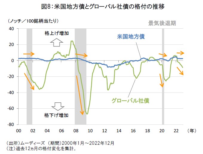 過去の米国地方債とグローバル社債の格付けの推移を比較すると、景気後退期には社債への格下げ圧力が高まりやすい一方、米国地方債の格付けは相対的な安定が維持されてきました(図8)。