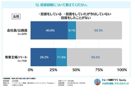 女性の投資経験に関する質問を職業別に集計したところ、「投資をしている」と回答した会社員または公務員の女性は40.6%、専業主婦またはパート・アルバイトの女性は28.2%となりました。会社員または公務員の女性は全体平均よりも高い割合となっており、投資に取り組んでいる人が多いことがうかがえます。