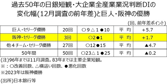 なお、過去50年の日銀短観・大企業・全産業・業況判断DIの変化幅(12月調査の前年差)をみると、過去50年の平均は▲0.2ポイントですが、阪神がセリーグで優勝した年は+1.7ポイント改善しています。22年12月の大企業・全産業・業況判断DIは+13で、23年9月は+17、12月見通しは+16です。見通し通りだと+3ポイントの改善が見込まれます。