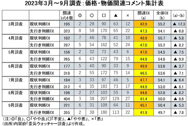 9月の『景気ウォッチャー調査』で、景況感の足を引っ張った悪材料として目を引くのは「価格or物価」関連の判断です。現状判断で221人がコメントしDIを作ると45.1と景気判断の分岐点50を下回る水準です。先行き判断で「価格or物価」関連のコメントは355人で、関連DIは41.9です。9月の『景気ウォッチャー調査』で、「価格or物価」関連は、最近月と同じく、多くのウォッチャーが景況感にマイナスの影響を与える項目と見ているようです。