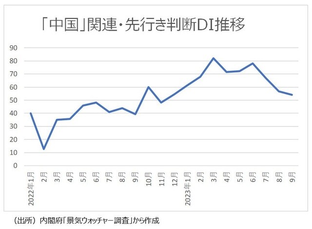 「中国」関連先行き判断DI、足元は50超ながらも鈍化傾向