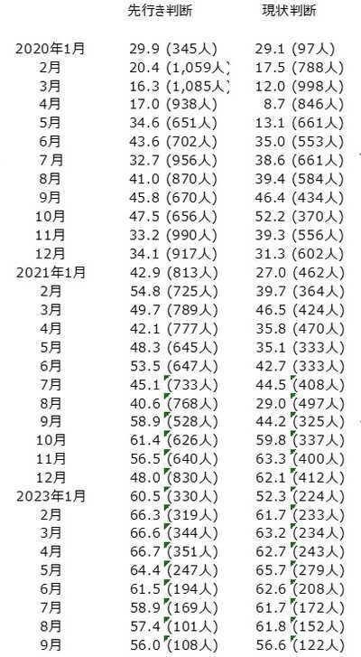 「処理水」関連現状判断DIは、8月では現状判断DIは41.7(コメント数3人)、先行き判断DIは39.7(コメント数29人)でしたが、9月では現状判断DIは45.8(コメント数6人)と2ヵ月連続分岐点の50割れになりました。但し、先行き判断DIは59.4(コメント数8人)で50超になりました。「処理水の海洋放出以降も訪日客数に影響がないように思えるため、今後もインバウンドに期待している(東京都:家電量販店〔店長〕)」というコメントが出てきました。