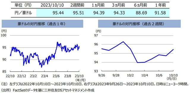 ここ2週間の豪ドルの対円レートは、わずかに下落しました。10月3日に開催された豪州準備銀行(RBA)の金融政策決定会合は、ブロック新総裁が就任してからの初会合となりましたが、政策金利は据え置かれました。据え置きは市場予想の通りで、声明文についても大きな変更はみられませんでした。一方、9月央のFOMC(米連邦公開市場委員会)では2024年に見込まれている利下げの開始時期が後ずれするとの見通しが示されていたため、豪ドルは対米ドルで下落しました。また、米ドル円レートは一時1米ドル=150円をつけた後、為替介入への警戒感等から米ドル高円安が一服しました。これらを背景に、豪ドルの対円レートは、期間を通してわずかな下落となりました。