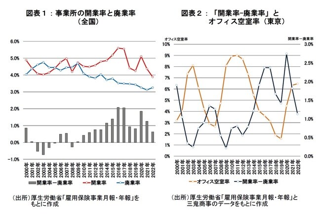 東京の「開業率-廃業率」と「オフィス空室率」の関係をみると、「開業率-廃業率」が拡大した時期は空室率が低下し、縮小した時期は空室率が上昇したことが確認できる。両指標の相関係数(2000年~2022年)はマイナス0.64と、負の相関関係が認められる(図表2)。