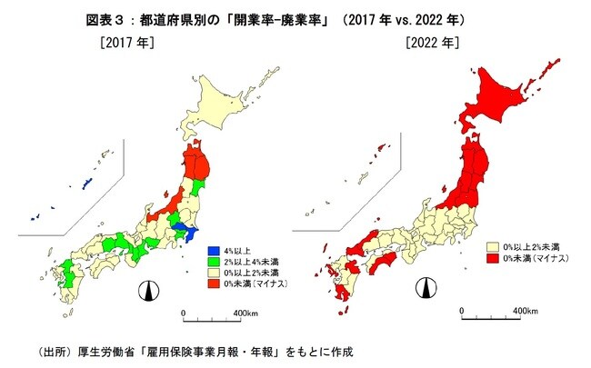 その後、開業率低下の影響を受け、2017年をピークに縮小傾向に転じ、2022年は0.6%となった(図表1)。また、「開業率-廃業率」を都道府県別にみると(図表3)、ピーク時の2017年は「マイナス」(廃業率が開業率を上回った)の都道府県数は「5」に過ぎなかったが、2022年は「15」と大幅に増加した。