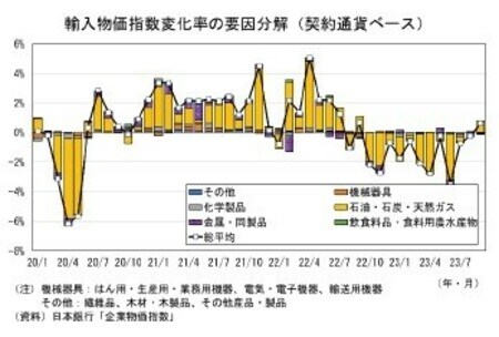 2023年9月の輸入物価は、契約通貨ベースでは前月比0.6%(8月:同▲0.2%)と12ヵ月ぶりにプラスに転じた。また、2023年9月の円相場(対ドル)は前月比2.0%とプラスとなったことで、円ベースでは同2.1%(8月:同1.7%)と2ヵ月連続でプラスとなった。円ベースの前年比は▲14.0%(8月:▲11.4%)と6ヵ月連続でマイナスとなった。