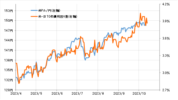 この間の両者の関係を前提にすると、米10年債利回りが4.5%割れへ一段と低下した場合は、日本の10年債利回りも0.75%を下回る可能性が高く、その場合日米10年債利回り差米ドル優位は3.75%程度への縮小が見込まれます。これをこの間の米ドル/円との関係に当てはめると、米ドル/円は147円割れへ下落する見通しになります。