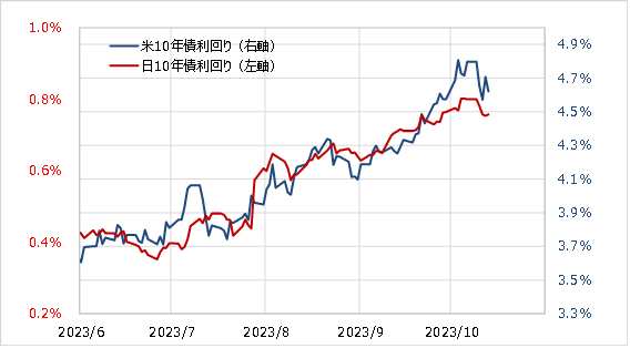これまでは7~9月期の米実質GDPが「5%成長」といった異例の高成長の可能性もあるなど、強過ぎる景気を受けた大幅な米金利上昇が展開してきましたが、次第にそのような金利の「上がり過ぎ」が景気をどこまで減速させるかに、金融市場の注目がシフトしている感じがあります。そうであれば、予想通り弱い米景気指標の結果が出た場合に、米金利が一段と低下に向かう可能性があります。