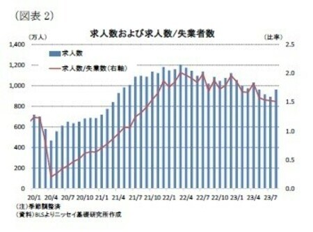 求人数は22年3月の1,203万人をピークに低下基調が持続しているが、23年8月は961万人と前月の892万人から4ヵ月ぶりに増加に転じた(図表2)。求人数は新型コロナ流行前の700万人の水準を依然大幅に上回っている。