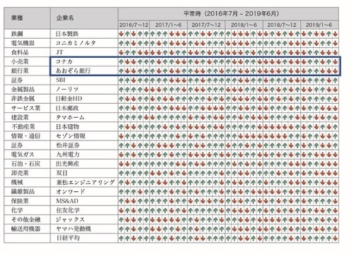 日々市場では、さまざまなことが起こっている。そして、そのなんらかの変化に反応して株価は変動する。以下は、図表1の業種ごとの高配当企業の株価が、前月と比較して上がったか(↑)、下がったか(↓)を時系列で示したものである。図表2がコロナ前の平常時、図表3がコロナ時である。