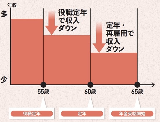 多くの会社では定年前に役職定年を設けている。このタイミングで収入が下がってしまうため、教育費やローンの支払いがあるとやりくりが大変に。