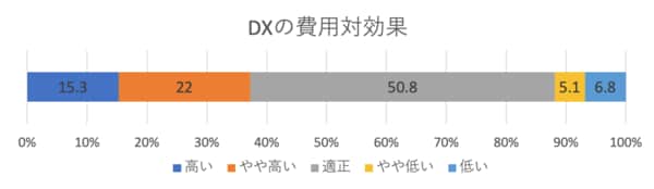一方で「DX導入の費用対効果についてどう思うか」と聞いたところ、最も多かったのは「適正」で50.8%に達した。「高い」は15.3%、「やや高い」は22%だった。「適正」以上の評価は合計で9割近くに達した。「やや低い」は5.1%、「低い」は6.8%に過ぎなかった。この結果からは、中小経営者が「少ないDX投資の割に一定の効果をあげている」と考えていることが分かる。