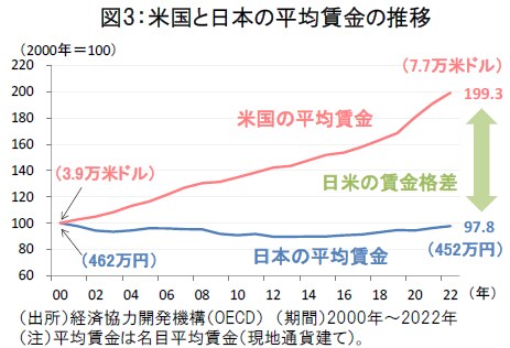過去20年余り、日本の物価や賃金は米国と比較してほとんど上昇してこなかった上に、コロナ禍以降は米国のインフレと賃金上昇の加速に出遅れる傾向が続いています(図2・3)。