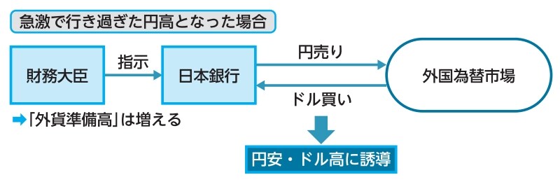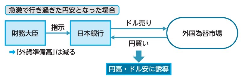 市場介入によりドルよりも円の需要が増え、ドル/円レートは「円高・ドル安」方向に修正され、安定することが期待されます。このとき介入(ドル売り)に使うドル資金は、「外貨準備高」から支出されます([図表1])。