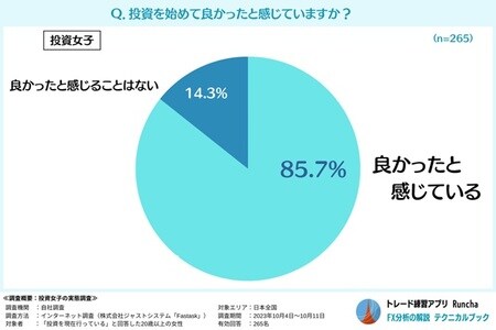 結果は、投資を始めて良かったと感じている投資女子が85.7%で、投資を始めて良かったと感じていない投資女子が14.3%という数字です。投資を始めた女性のほとんどが、前向きに投資と向き合っているといえるでしょう。
