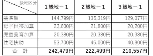 たとえば、シングルマザーについて、受け取れる生活保護費の額はお住いの級地区分の別により、次のようになります。