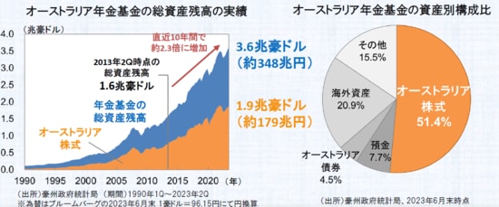 オーストラリア年金基金(スーパーアニュエーション)の総資産残高は、人口増加や拠出負担率の引き上げ等により、直近10 年間で約2.3倍まで増加しています。スーパーアニュエーションの資産構成を見ると、51.4%がオーストラリア株式となっており、こうした動きはオーストラリア株式相場の下支え要因になることが期待されます。