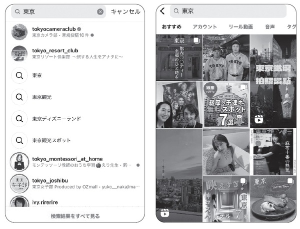 例えば、インスタグラムの検索窓に「東京」と入力すると、最初はアカウントや、関連キーワードが表示されます。