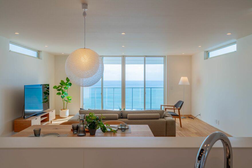 階段を登り切ると圧巻の大海原と広いLDKが広がっている。食事を楽しむダイニングテーブル一式のほかに、ソファセットやテレビ台まで収容可能な約45平米の広さが魅力だ。