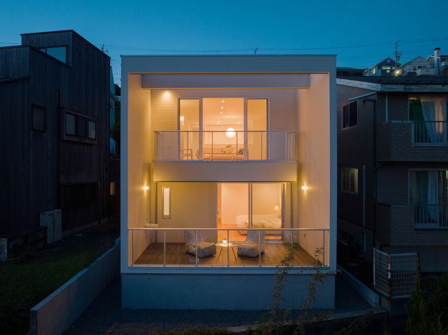 「建物の中で海に面した一面には、1階にテラス、2階にベランダを設置しています。その空間の左右に大壁、上部に梁を設けたことで、外部からの視線を気にせずくつろぐことができ、額のような正方形となっており、その為、室内の開放部からは、美しい海の風景を絵画のように楽しむことができます」