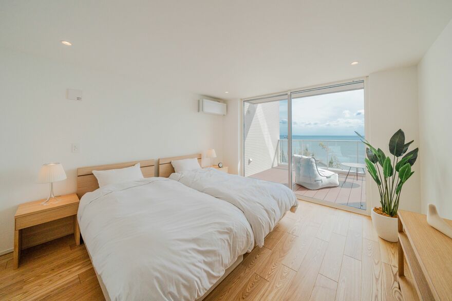 ふたつのベッドが並ぶ主寝室は約15平米。室内にはウォークインクローゼットが設えられている。それほど広いスペースではないが、開放的な雰囲気に溢れているのは、やはり開口部からテラスの先に広がる青い海が見えるからだろう。