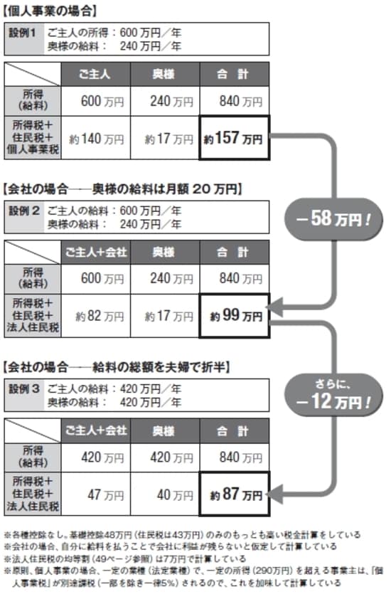 では、このケースで会社にした場合は、税額はいくらになるでしょうか。夫の役員報酬を、所得600万円を12カ月で割って月額50万円とし、妻の給料は月額20万円とします。