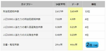 人口が多いこともあり、刑法犯認知件数が多いこの地域。しかし、人口当たりの値で考えるとそこまで治安が悪いわけではなく、1000人当たりの火災発生は14区内4位の少なさです。