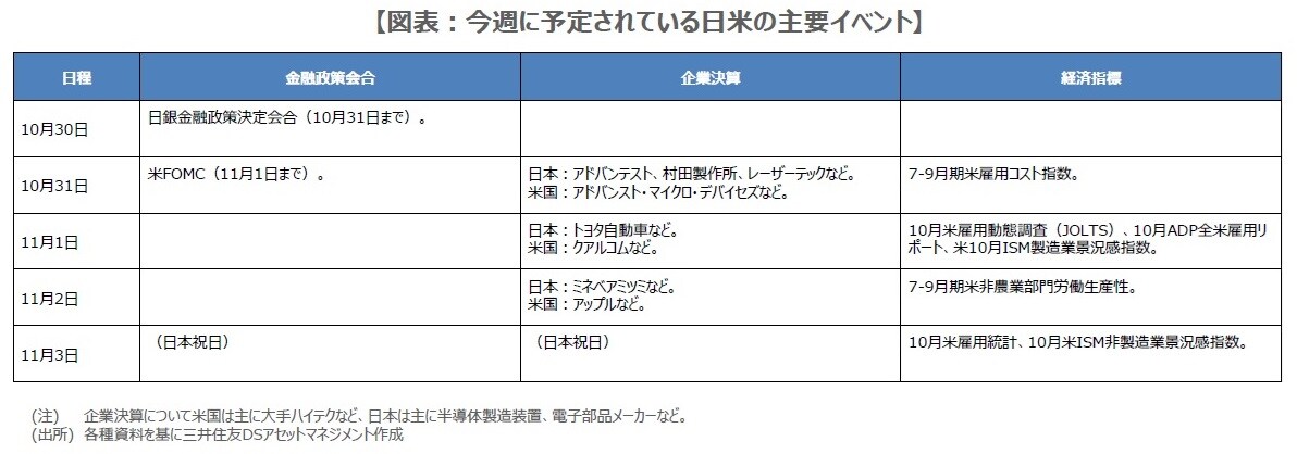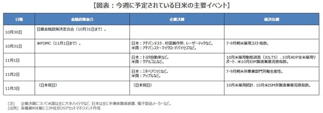最後に、経済指標に目を向けると、米国では10月31日に雇用コスト指数、11月1日に雇用動態調査(JOLTS)、ADP全米雇用リポート、米サプライマネジメント協会(ISM)製造業景況感指数、2日に非農業部門の労働生産性、3日に雇用統計、ISM非製造業景況感指数が発表されます。雇用関連の指標が多く、労働市場の減速傾向が確認されれば、米国市場では、長期金利低下、ドル安、株高の反応が予想されます。