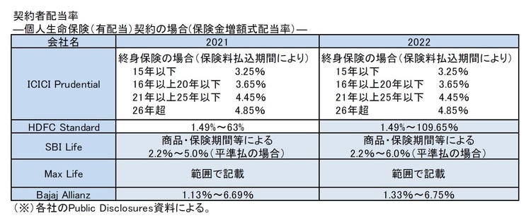 なお、IALM(2012-14)等への調整率については、2020年度において、4社が2019年度から見直している。また、2021年度においては、ICICI Prudential、HDFC Standard、SBI Lifeの3社が調整率の見直しを行っている。