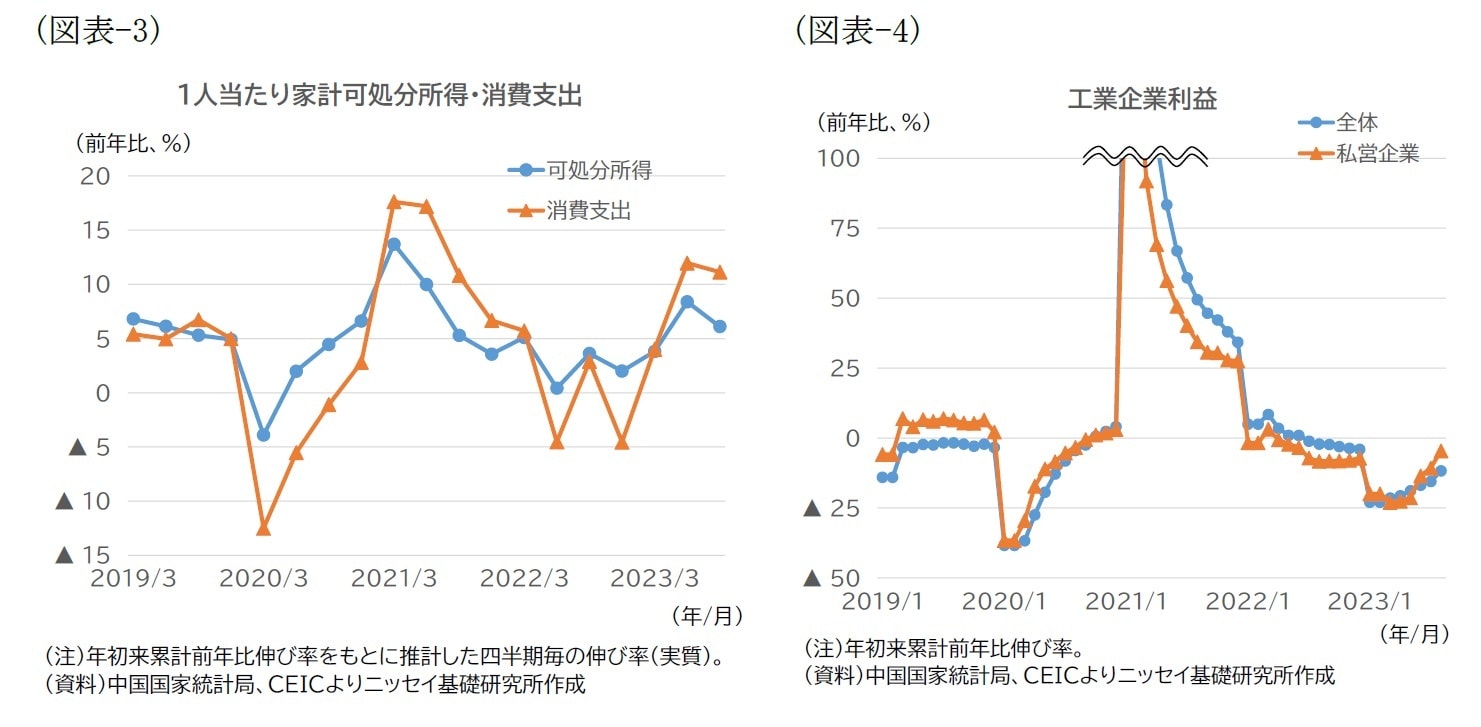 例えば、家計部門に関して、調査失業率は、若年層(16~24歳)では依然高止まりしている可能性が高いが、全体としては年初来着々と低下している(図表-2)。また、1人当たり家計消費支出の伸びは、2023年に入ってから3四半期連続で可処分所得の伸びを上回っており(図表-3)、消費性向も上向きつつあるようだ。